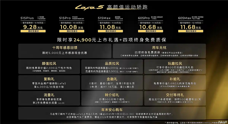 购车限时可享24900元上市礼遇+四项终身免费质保,限时现金优惠5000元、限时免费想价值2000元个性外饰配色、竞速灰内饰选装基金(4000元)、零跑本品用户增换购Lafa5享4000元/台现金补贴以及价值500元转介绍礼。