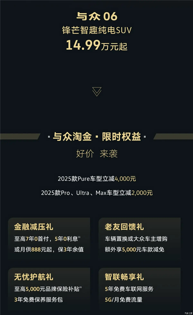 从官方了解到,2025款与众06发布最新限时权益。具体来看,该车限时售价为14.99万元起,根据车型不同还可提供2000元和4000元立减。此外官方还发布金融减压礼、老友回馈礼、无忧护航礼、智联畅享礼,有效期至2025年10月12日。与众06定位纯电紧凑型SUV,2025款车型于今年4月上市,官方指导价区间为18.99万-24.99万元。