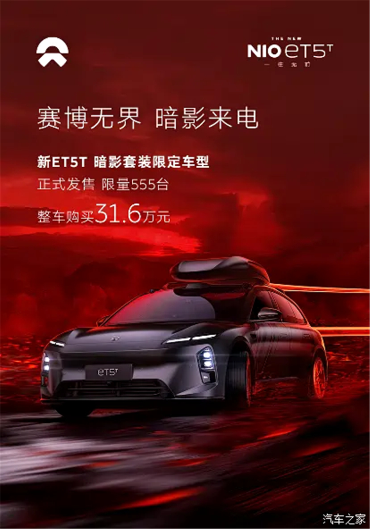 从蔚来官方获悉,旗下蔚来ET5T暗影套装限定车型正式上市,共推1款车型,整车售价31.6万元,BaaS后售价20.8万元,限量555台。该版本车型是与《创:战神》电影为灵感打造,车身上印有赛博光影拉花,个性化十足。同时官方还发布了购车专属权益:2025年10月31日(含)前锁单的用户,可免费选装交流充放电套装(或置换价值4000元的选装基金),并可享5年NOP+免费使用权,以及获赠价值9500元的适享套装。