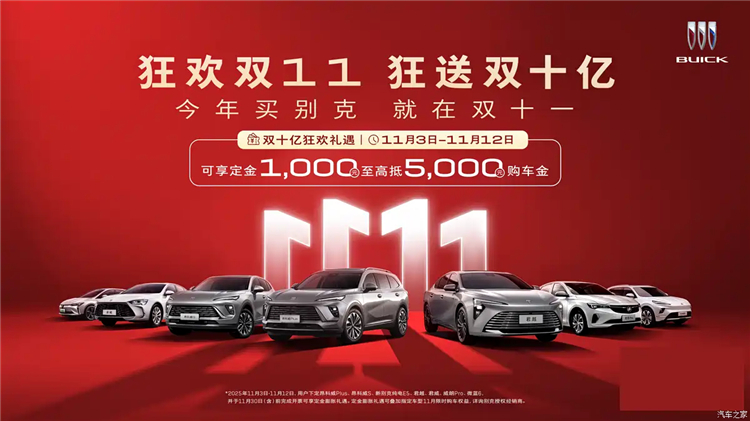 别克推出“狂欢双11,狂送双十亿”限时大促活动,11月3日至11月12日(含)期间,用户购买昂科威Plus、昂科威S、2025款君越、君威等车型可享定金1000元抵5000元。