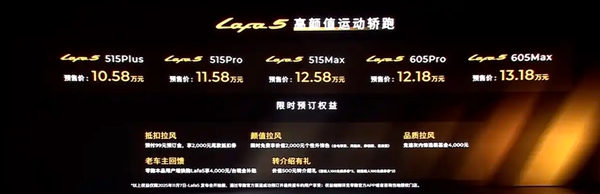 11月7日,零跑Lafa5开启预售,新车共推出5个车型版本,预售价区间为10.58-13.18万元。全新车型定位于纯电紧凑型车,基于LEAP 3.5架构B平台打造,CLTC工况下纯电续航里程可达515-605km,配备了8295芯片、激光雷达等配置。